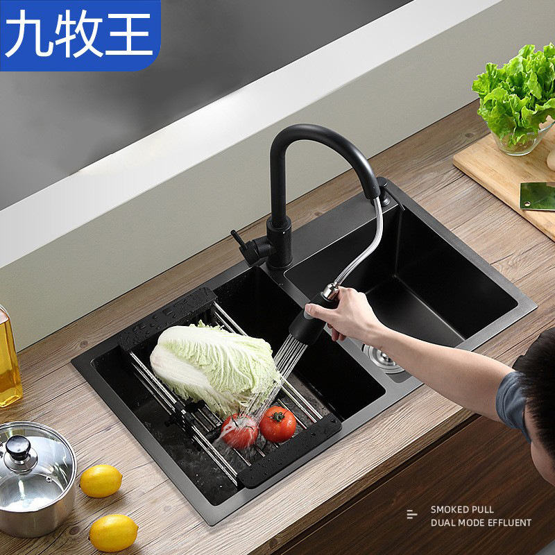 九 ᷂ 牧王新型水槽3.0mmナノキッチン家庭用黒色二槽野菜洗浄盆304ステンレス野菜洗浄