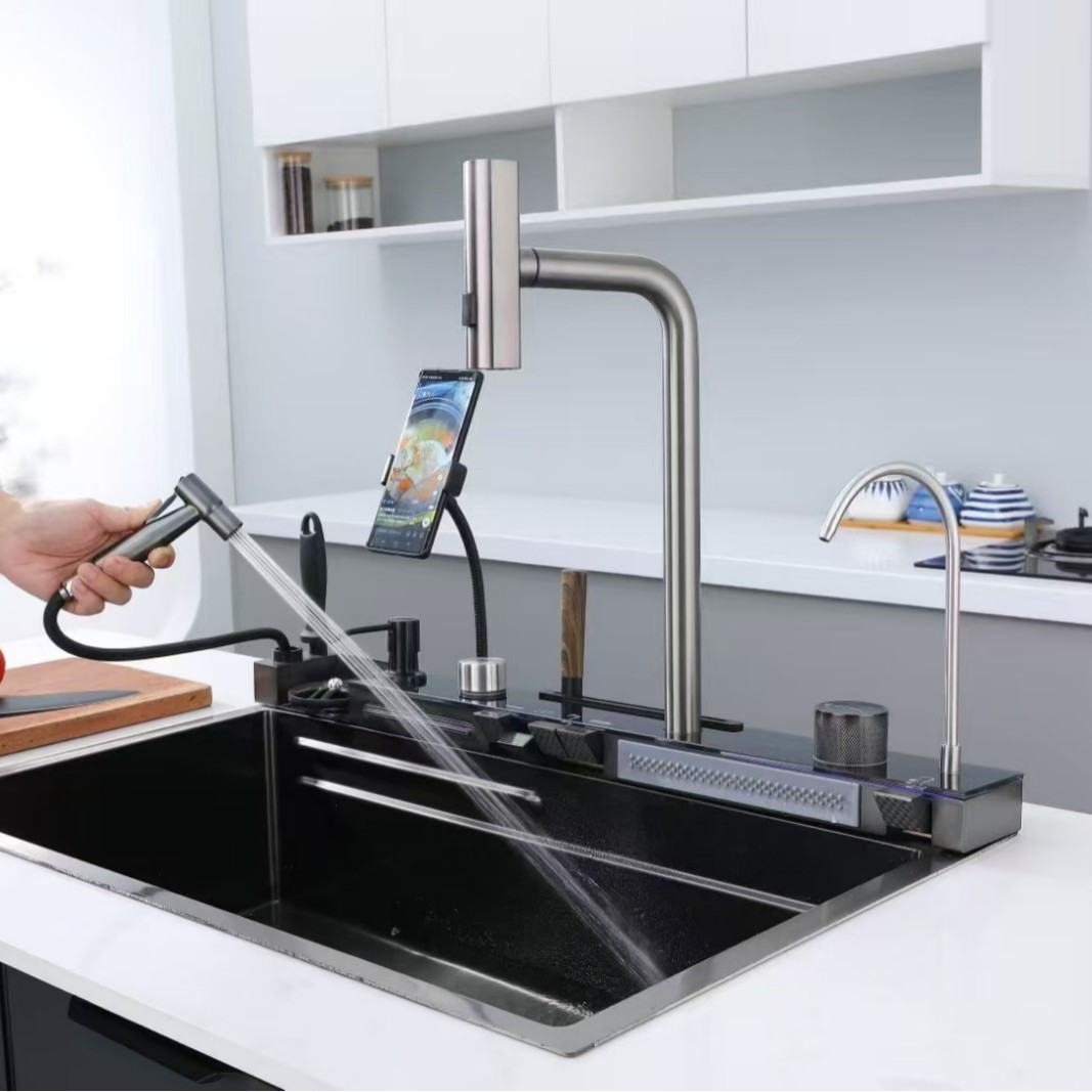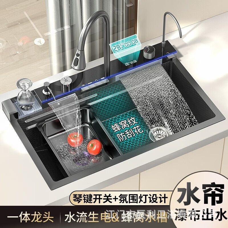 ガンメタルグレーのデジタルディスプレイ付きレインフォール滝型シンク、大型シングルシンク、ナノ304ステンレス製キッチン手作りアンダーカウンター洗面台