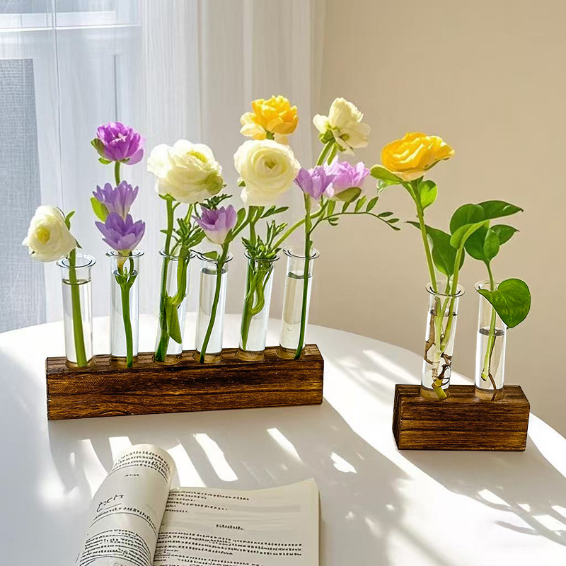 クリエイティブ試験管花瓶水耕栽培緑植物フラワーアレンジメント植物容器シンプルな木製ラックカウンタートップ装飾フラワーアレンジメント装飾品