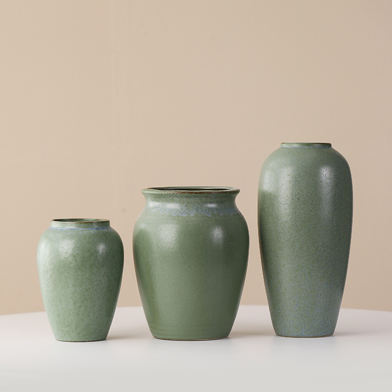 緑色の陶器の花瓶、梅瓶、水耕栽培、中国風の花瓶、大口径、レトロな花瓶、水栽培、ドライフラワー、レトロスタイル
