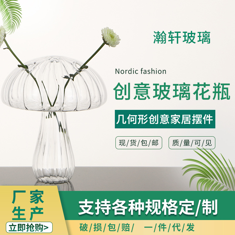 創意ガラス花瓶ins風日本式清新キノコガラス花瓶置物水培透明食卓小花瓶