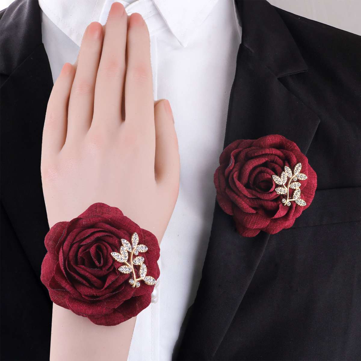 欧米の結婚式の暗い赤いバラの金の葉の新郎の新婦の結婚する胸の花の花嫁の連れ合いの手首の花の結婚式の用品