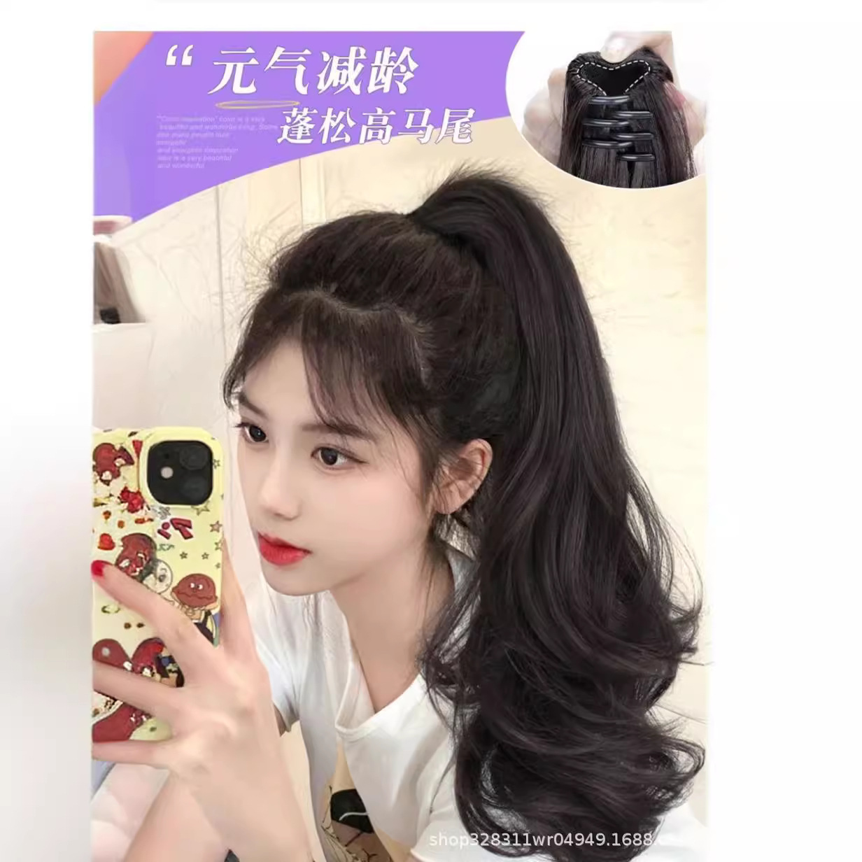 かつらつかみカール高ポニーテール女性自然大きな波ポニーテール模造髪ネット赤ロングヘアクリップ低ポニーテール