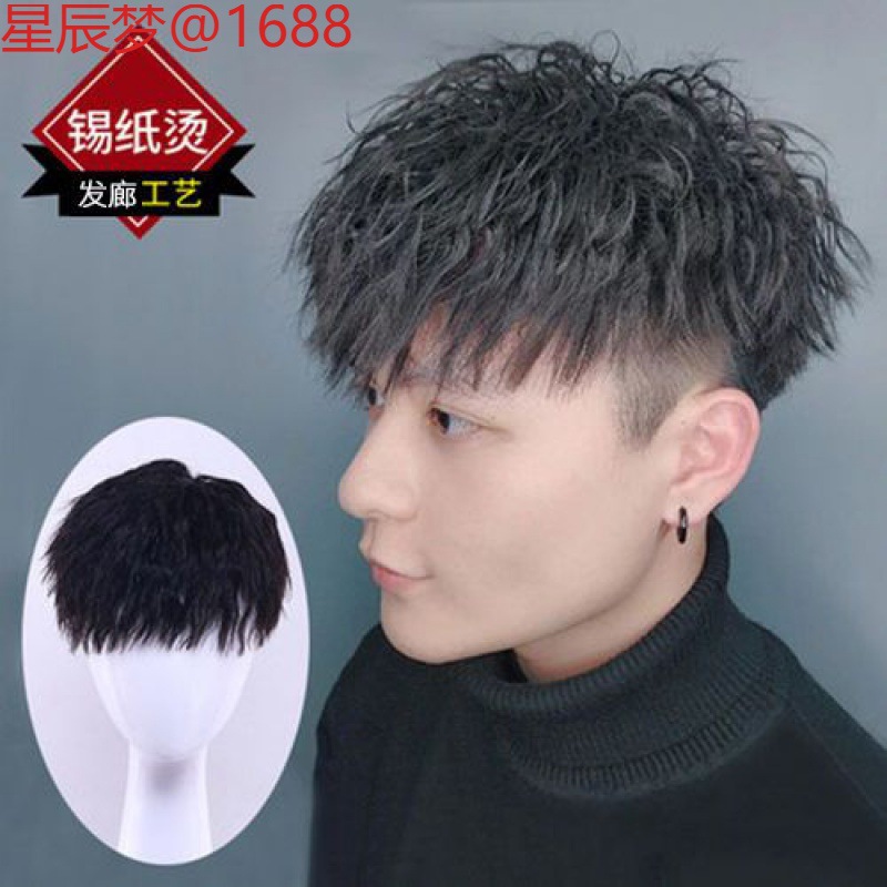 ショートヘアの男性用ウィッグ、韓国風ハンサムなアルミホイルパーマインスタントラーメンカーリーヘア、目に見えないシームレスなフルリアルヘア、額と頭頂部の交換用ヘアピース