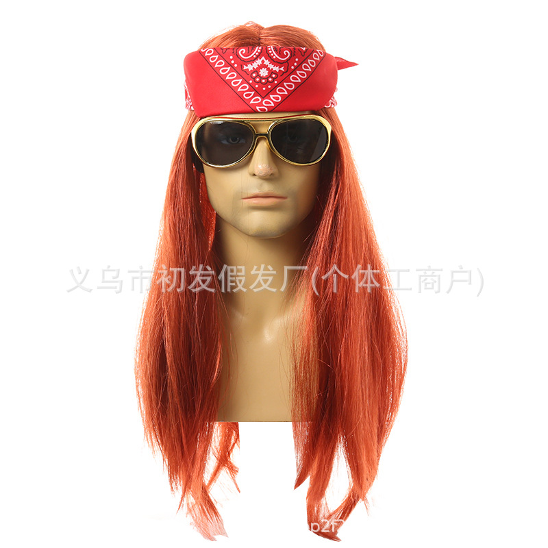 Amazonハロウィン80sパンクヘビーメタルオレンジ色ロングストレートディスコCOS装饰欧米メンズかつら