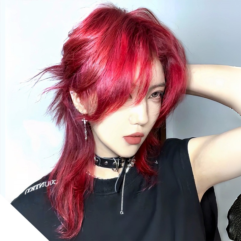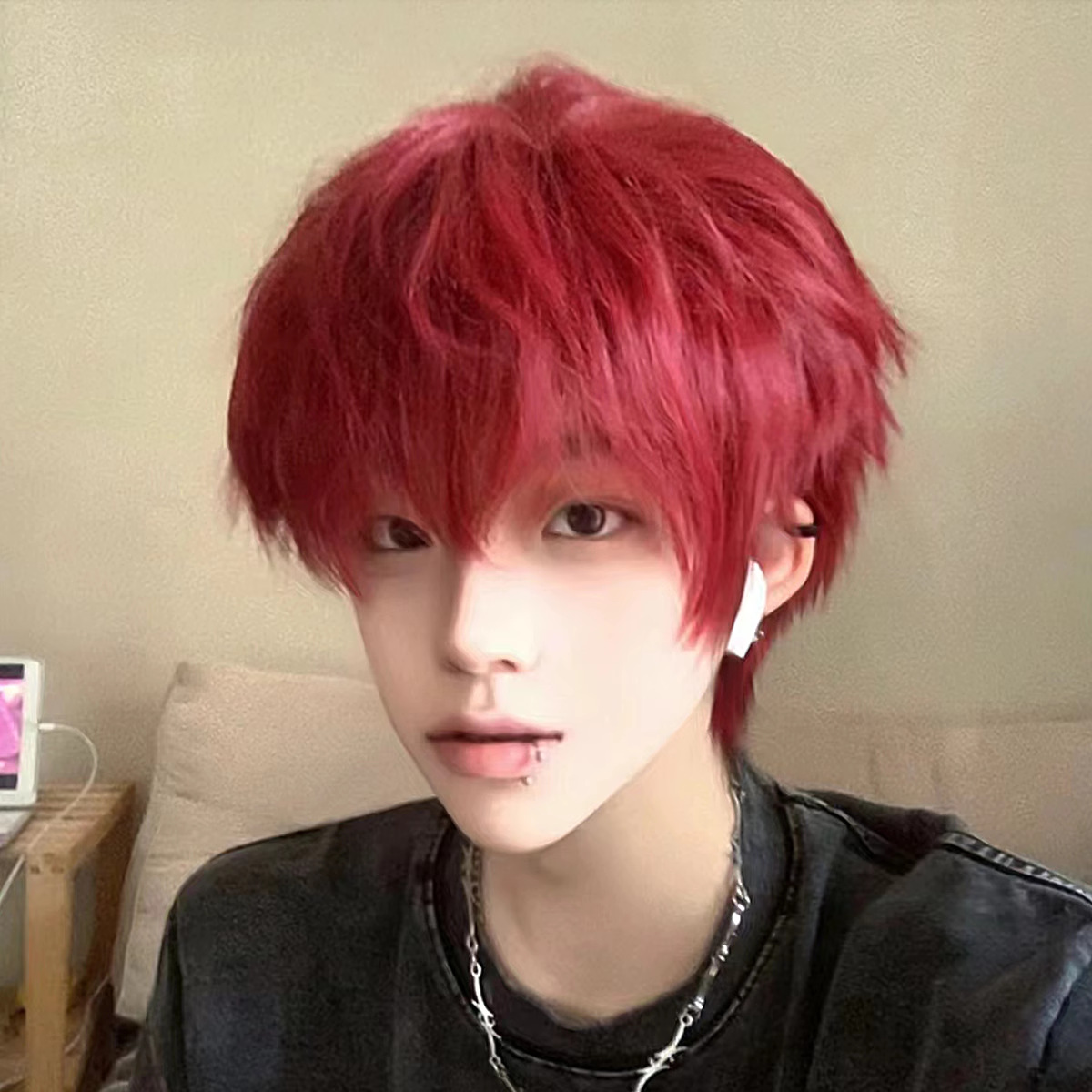 かつら男子のショートヘアのラズベリーレッドの格好いいファッションの短いストレートヘアの男性の髪型は日常的に前髪をそろえています。