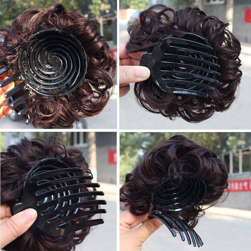 かつらの髪は盤頭のつぼみを包んで、クリップ式の9つの花巻をつかんで、団子の頭を包んで、5色の大きい髪輪を整えます。