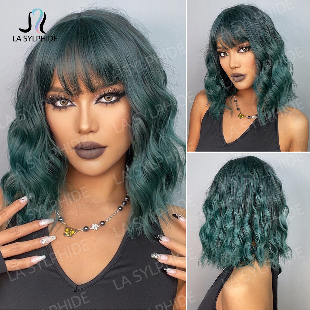 欧米のかつらの女性の全頭カバー化繊hair空気前髪の緑色のカールのボブのショートヘアの代行