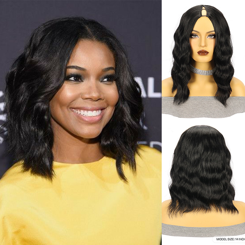 カツラ欧米レディースカツラV-PARTブラック中分短カール水波紋化繊ヘッドカバーwigs