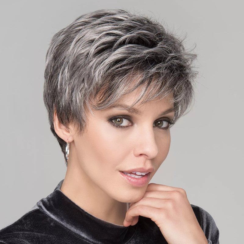 ヨーロッパとアメリカのかつら女性のファッション高齢者グレーと白の混合色のかつらショートカーリーヘア斜め前髪高温シルクふわふわかつらセット