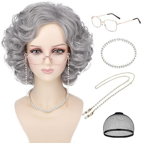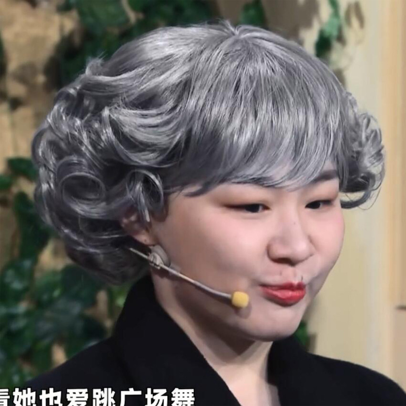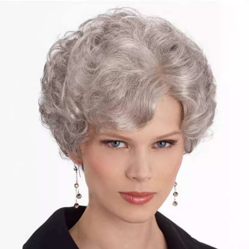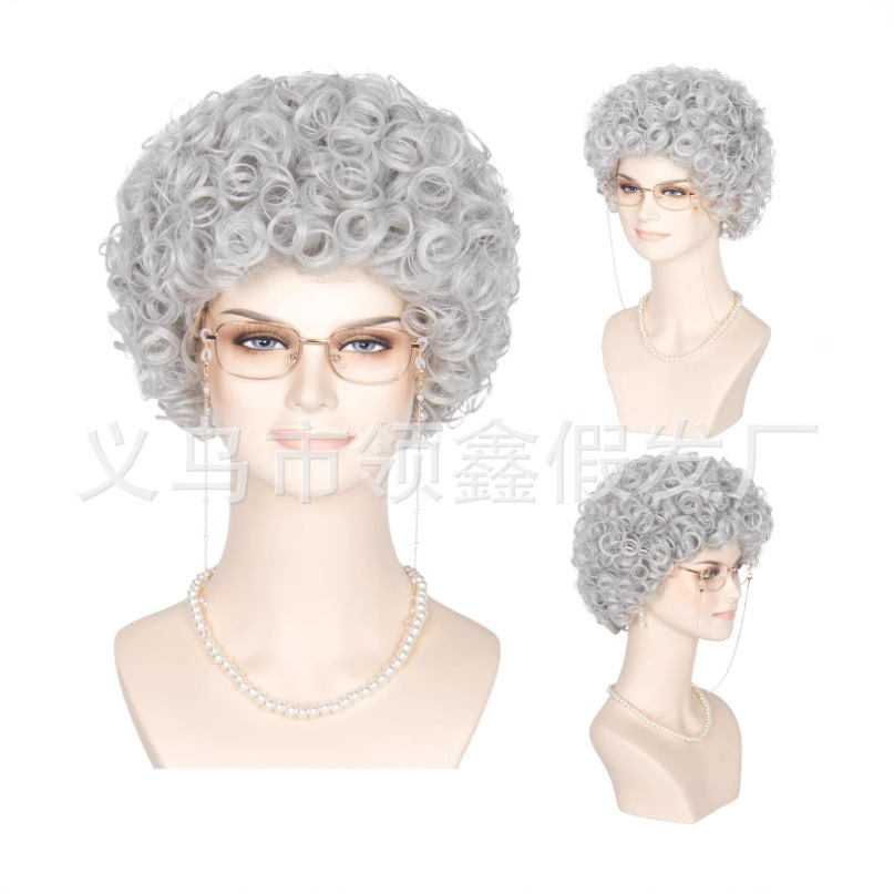 シルバーグレーショートカーリーおばあちゃんコスプレウィッグコスプレウィッグスタイリングヘッドギア