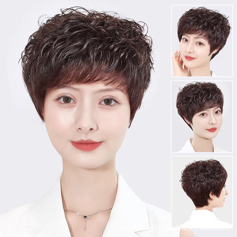 新しい女性の本当の髪の中高年のかつらの短い巻き髪の老人のお母さんのタイプの中年の女性の髪の老人のかつらのセットの化学療法