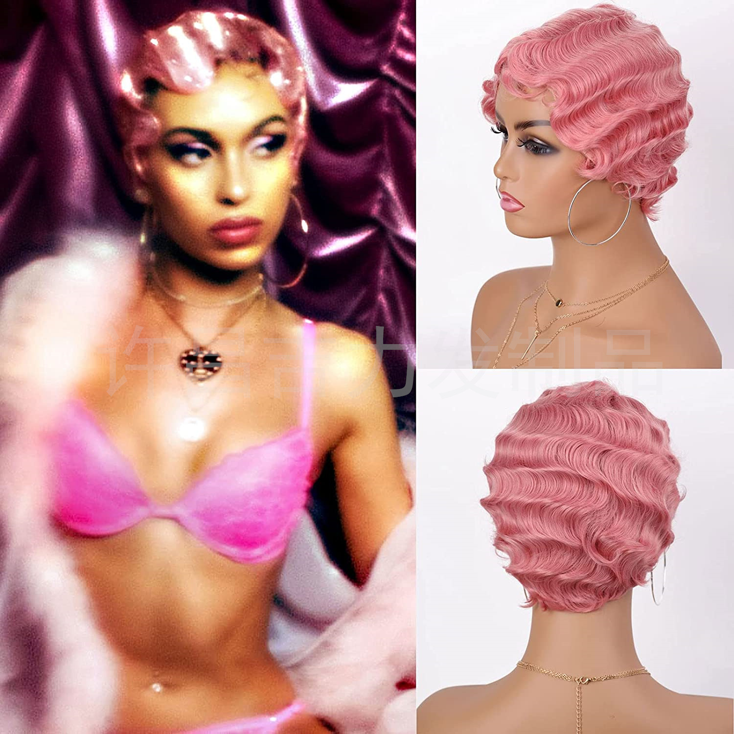 ヨーロッパとアメリカのクロスボーダーショートカーリーヘアレディースヘッドギアコスプレウィッグコスプレウィッグサイド分け大きなカーリースタイルヘッド