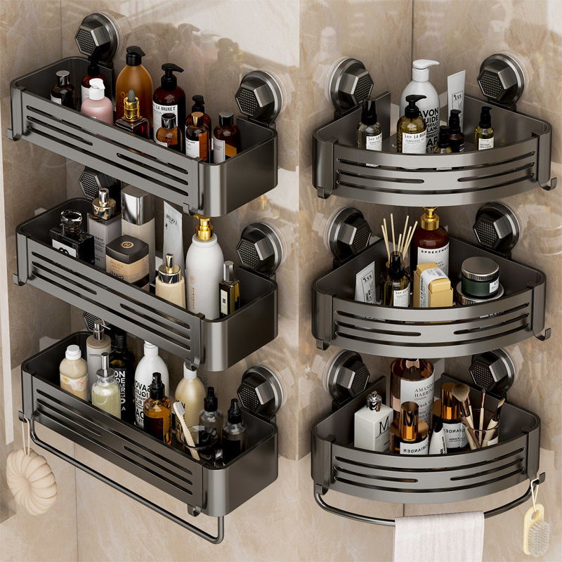 パンチングスペースなしのガンメタルグレーのバスルーム収納ラック、アルミ製壁掛け三角バスケット、バスルームトイレラック、単層強化