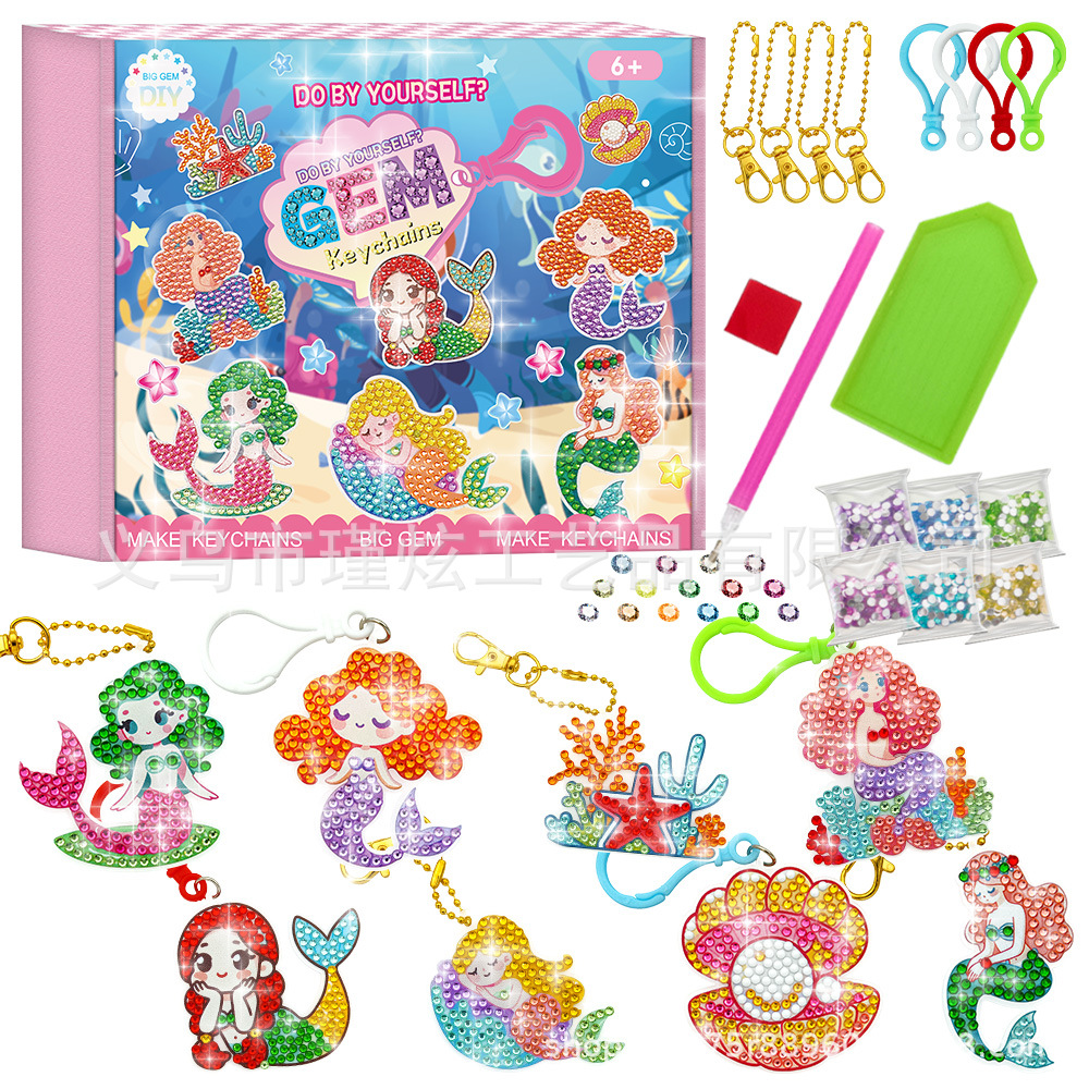 漫画風手作りDIYダイヤモンドペインティングキーホルダー、人魚、ユニコーン、知育玩具、子供用ダイヤモンドステッカー