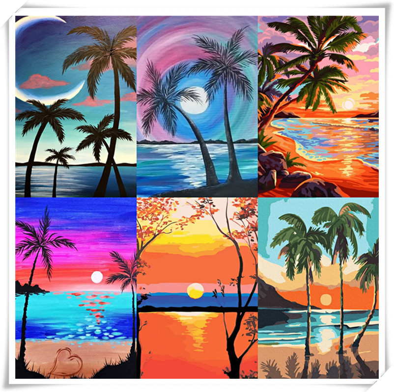 新しい5d海辺の夕日風景ダイヤモンド画アマゾンの起爆金diyココナツ樹海ダイヤモンド刺繍卸売り