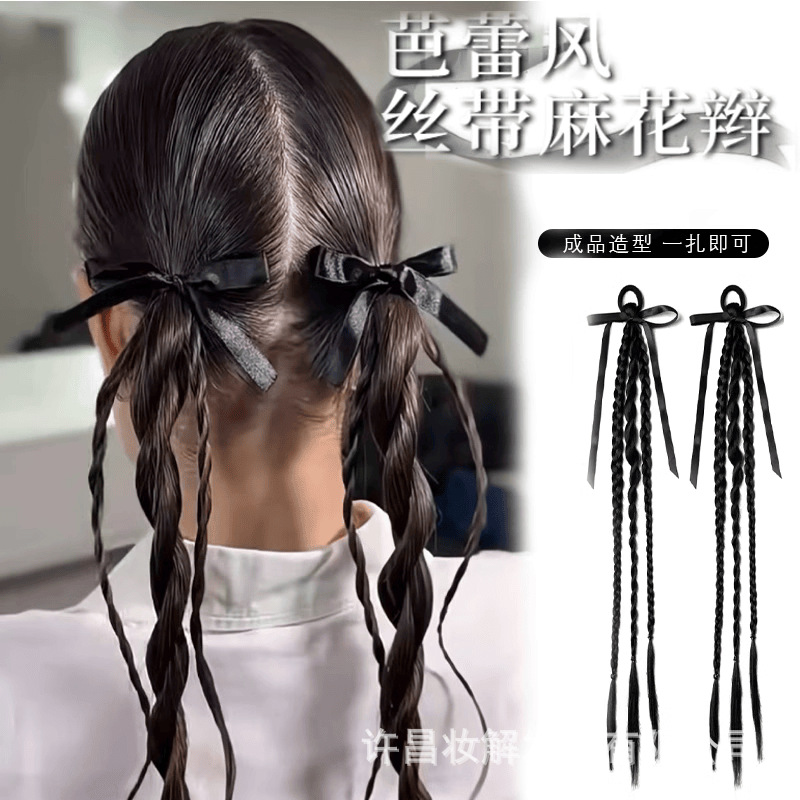 蝶結び三つ編みポニーテールクリップオンハイポニーテール巻き毛新しい中国風三つ編みナチュラルシミュレーションヘアウィッグポニーテール