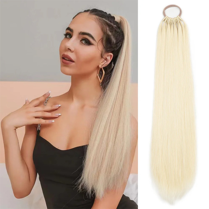 金色の26インチのロングタイプのストレート化繊ポニーテールの皮筋付きかつら欧米のファッションかつら