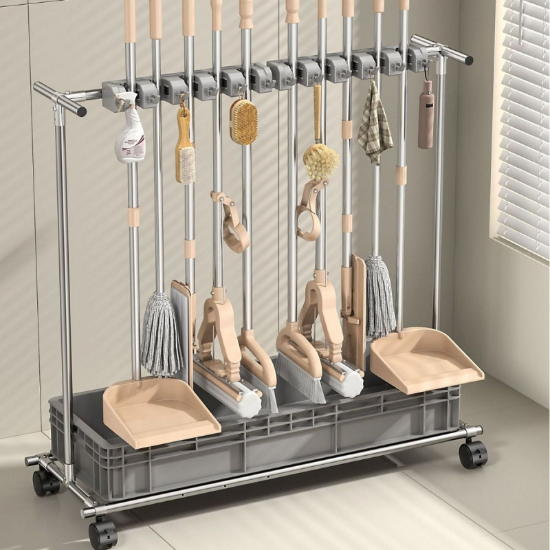 ステンレス移動モップラック床置き式ほうきモップ家庭用清掃道具床モップ収納置物