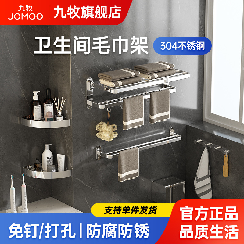 九牧浴室タオルラック、穴あけ不要の収納ラック、タオルバー、ステンレス製タオルハンガー、スペースアルミニウム折りたたみ式ハンガー