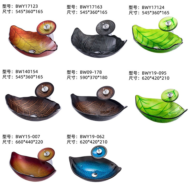 佛山風呂の新型の葉の形の浴室のガラスの洗面器の台の上でたらいの芸術の洗面器