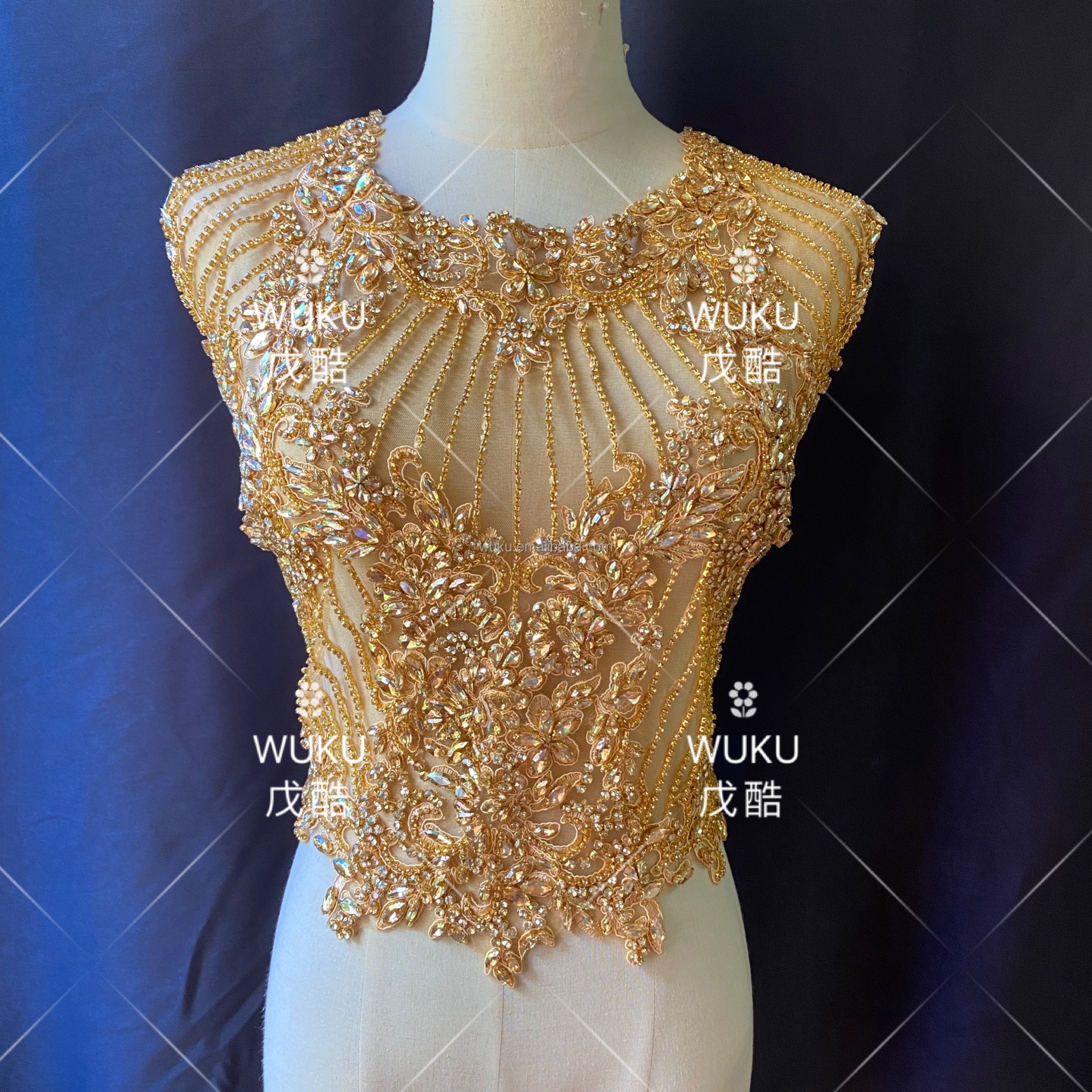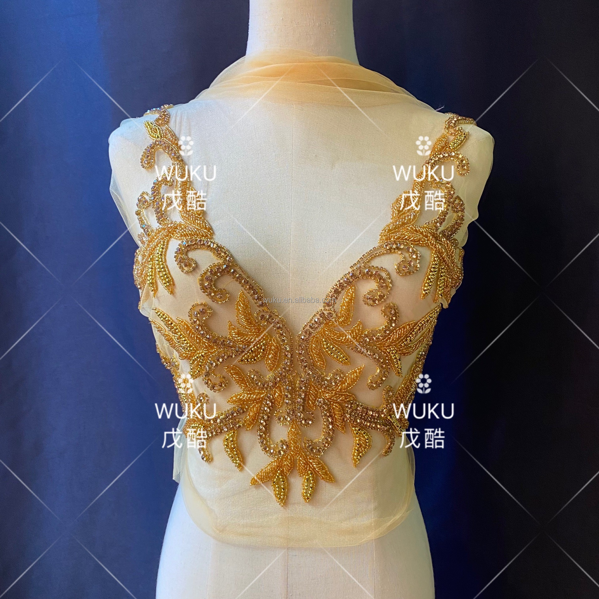 ペンクール33X72cmシャンパンゴールド色のウェディングドレス手作りスパイクビーズラインストーンレースアップリケLA-113