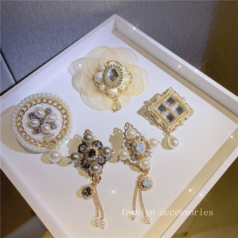 優雅なデザイン感のある大地色秋冬真珠韓国東大門幾何閃店胸花ブローチ流蘇アクセサリー