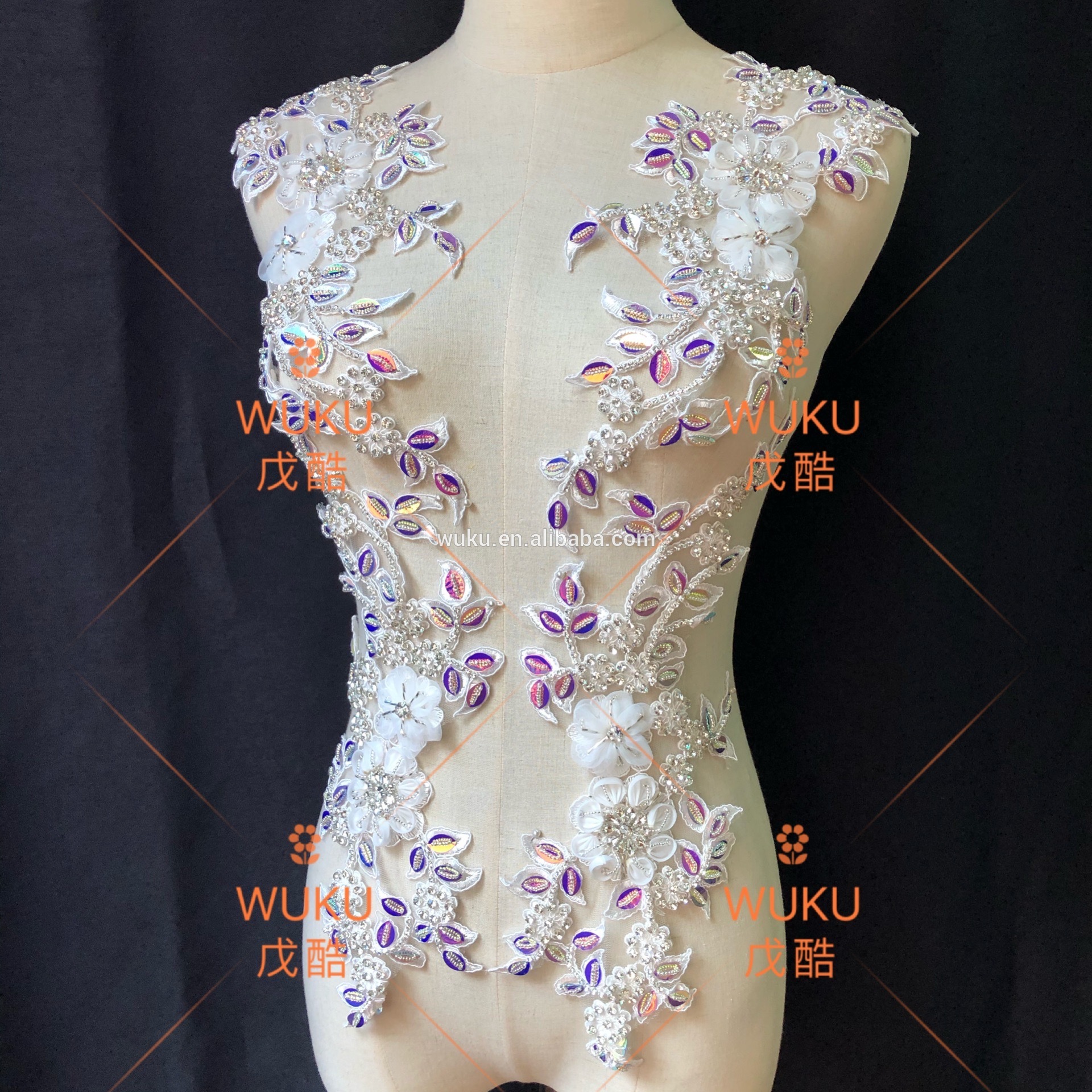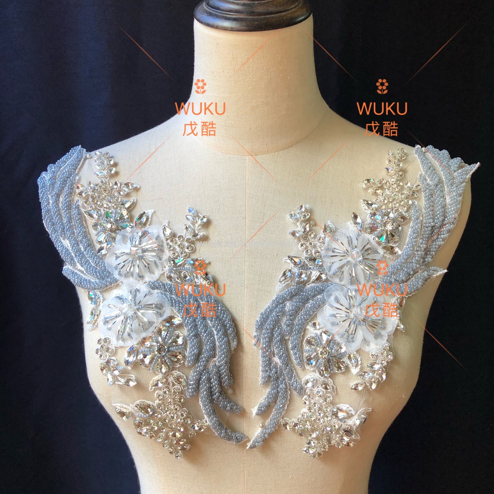 ペンクール2021新作33x22cm手作りビーズ羽レースペア花ウエディングドレスアップリケLA-331