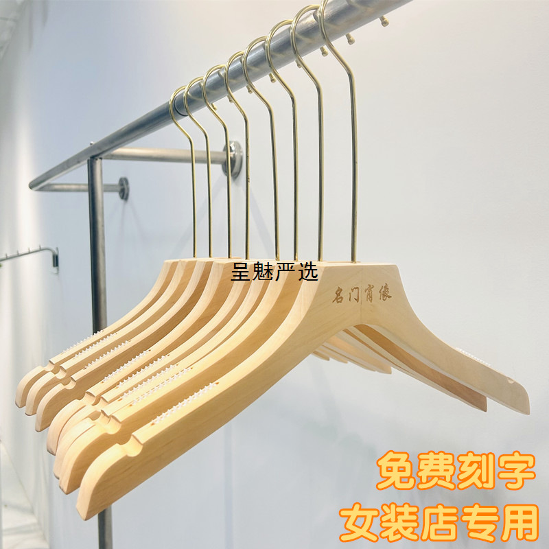 女性服店の実木ハンガーにはペンキのない植毛金の原木色の滑り止めズボン棚女装服には木製ハンガーが掛けられている