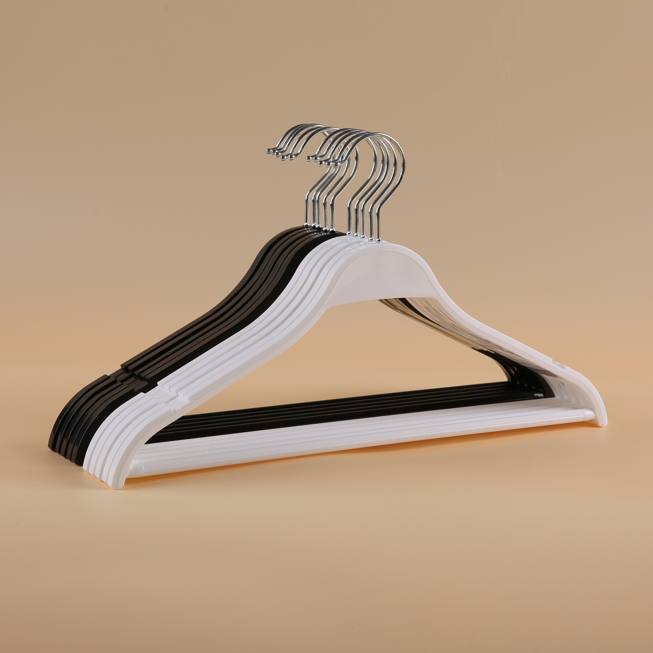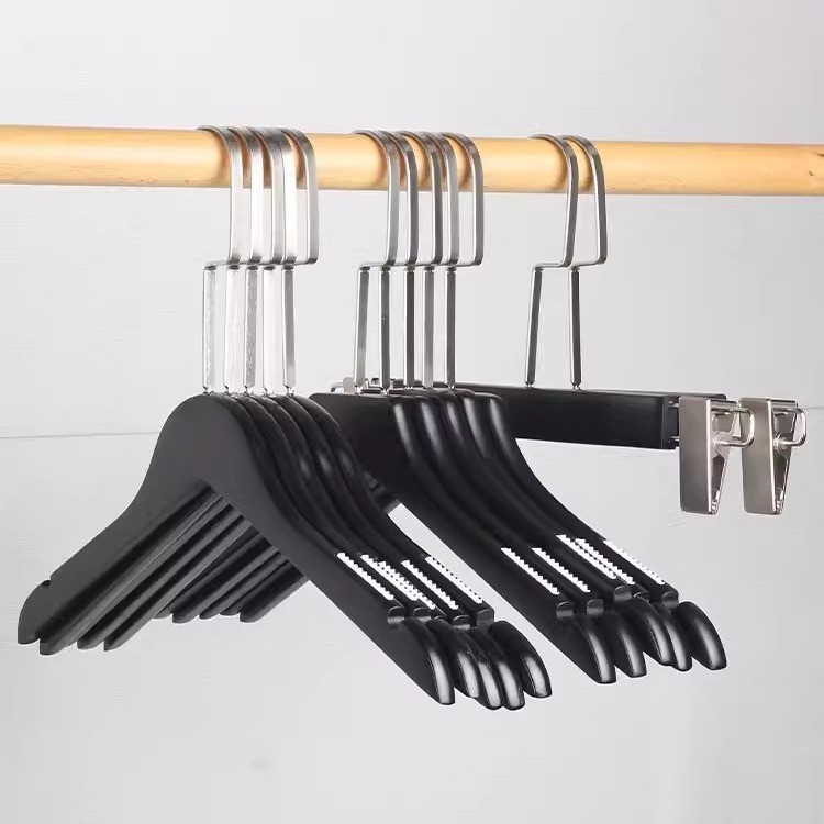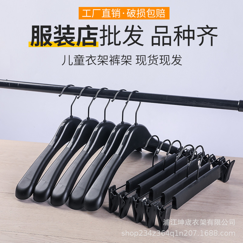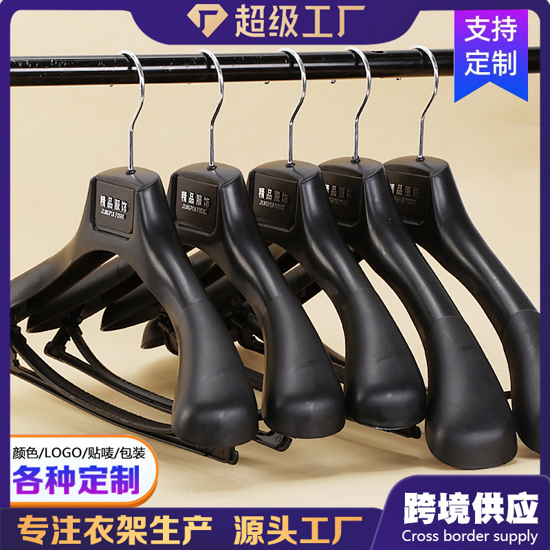 幅広肩無痕プラスチックハンガー、婦人服専門店向け、黒色衣類ハンガー、洋服掛け、ズボンハンガー、ズボンクリップ、卸売