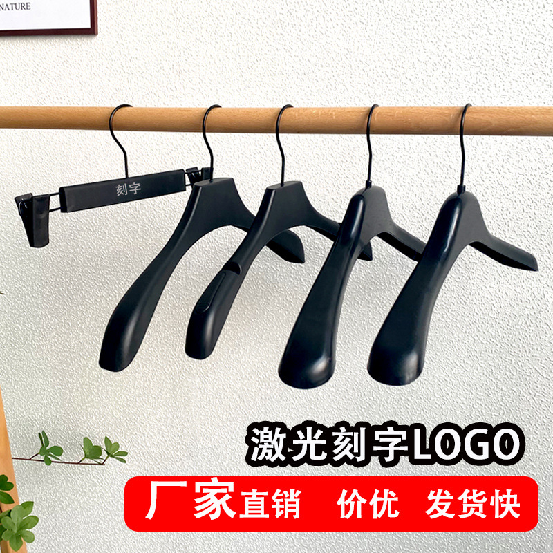 洋服店のプラスチックスーツのハンガーは肩が広くて、滑り止めがない服は黒いコートのロゴを支えています。