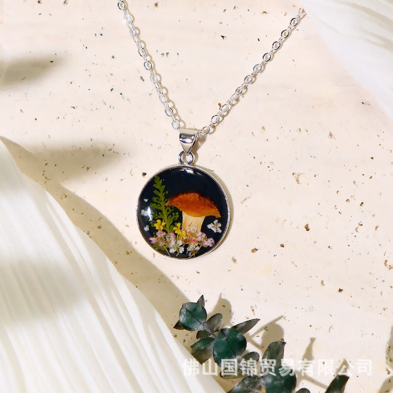 新品黒地丸いきのこレースウシダ真の花ドライフラワーネックレスのりドライ花ペンダントアクセサリーレジンネックレス