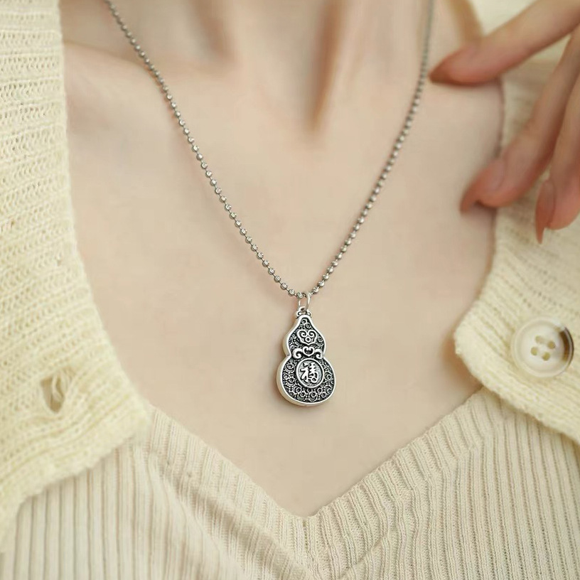 足銀999花糸透かし彫り福字ひょうたんペンダント女性国風福禄絞め糸純銀銭袋ペンダント直播金