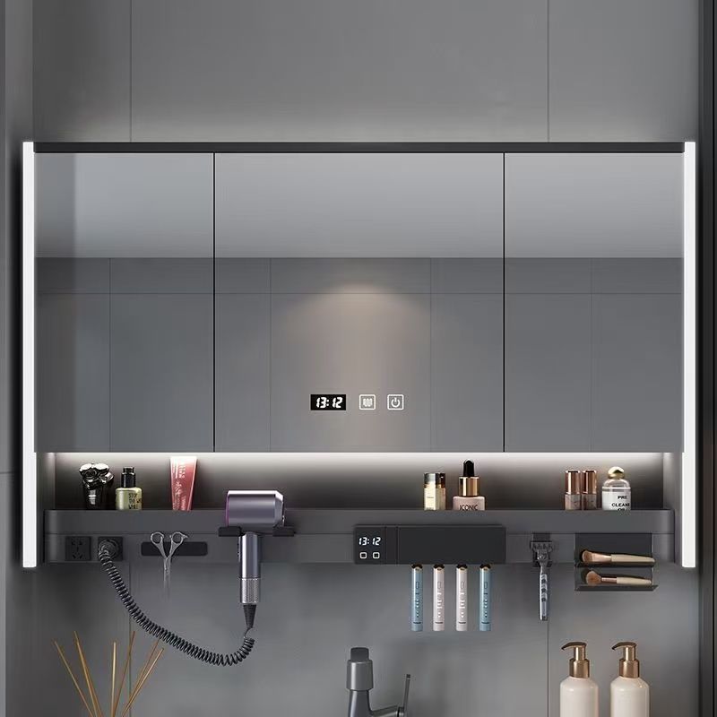 スマートバスルームミラーキャビネット、壁掛け式、防曇バスルームミラー、ヘアドライヤーラック、ライト付き収納オールインワンキャビネット