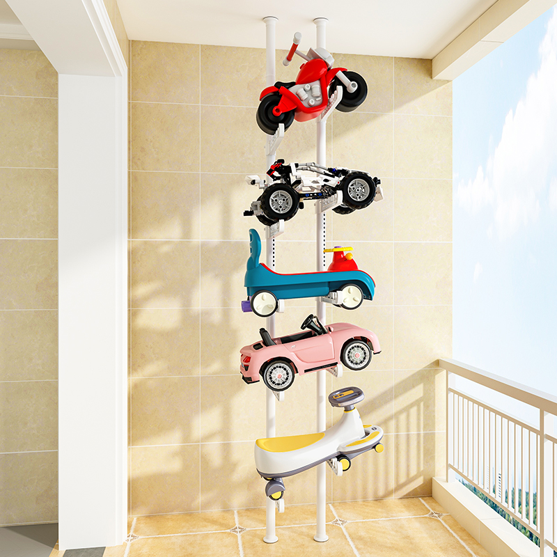 天に立っておもちゃの車の収納棚の客間に着地して多層の子供のスケートボードが自分でバランスがとれています。