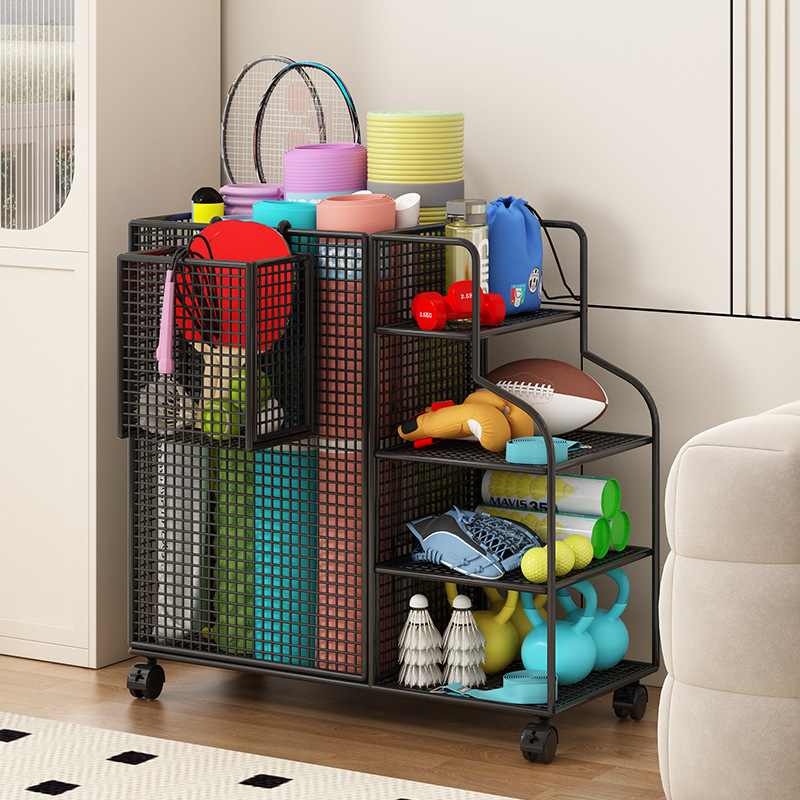 ヨガマット収納バスケット、ホームフィットネススポーツ用品収納、バスケットボールバドミントンラケット、ダンベル隙間収納棚