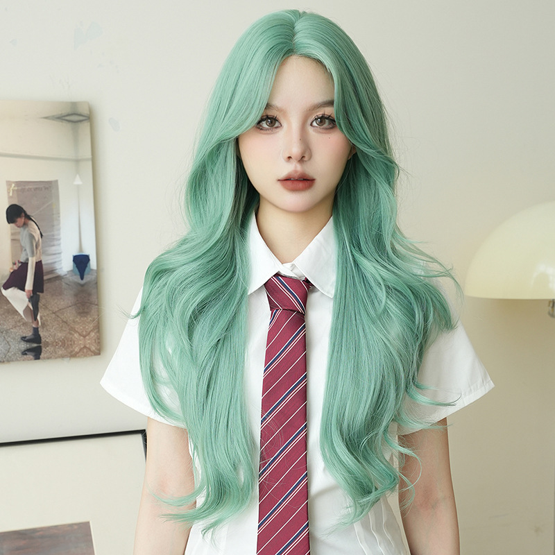 2025新型小額レース長巻き髪ミント緑網紅中分気質カール化繊シミュレーション全頭カバー