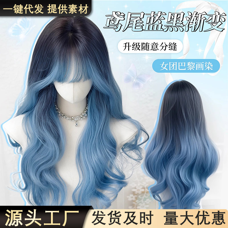 [アイリスブルーとブラック] 女性用フルヘッドウィッグ、大きなウェーブ、青と黒のグラデーション、前髪付き、人毛を模倣した毎日のフルウィッグ