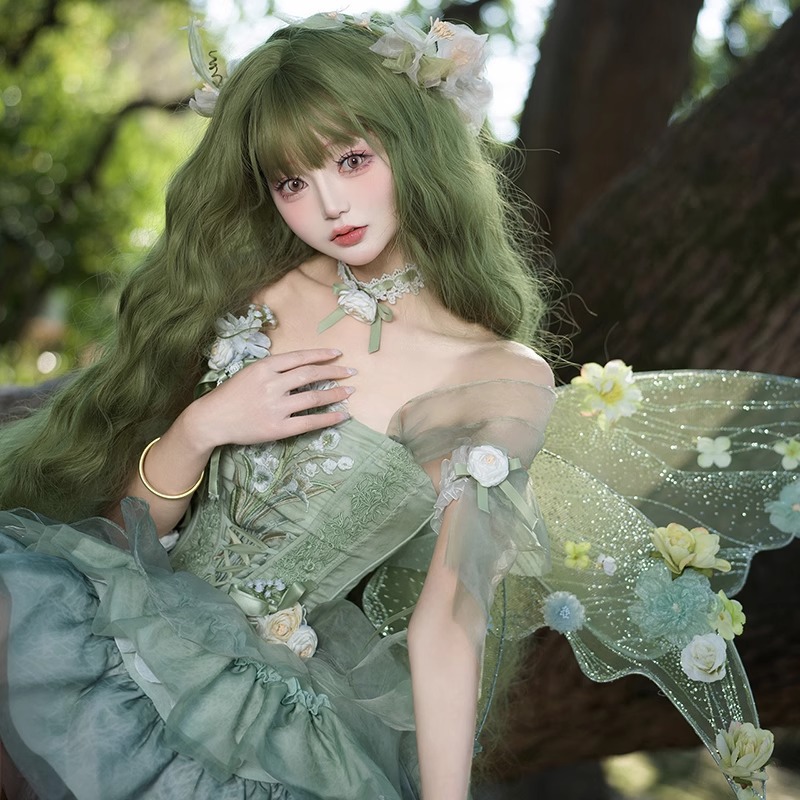 グリーンlolitaかつらレディースロングヘアcos超ロングウール巻きロングカール森系かつらナチュラルオールカバー