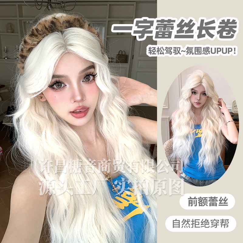 ヨーロッパとアメリカのかつらゴールデンフロントレースリアルなロングカーリーウィッグ女性のためのクロスボーダービッグウェーブふわふわフルヘッドギア