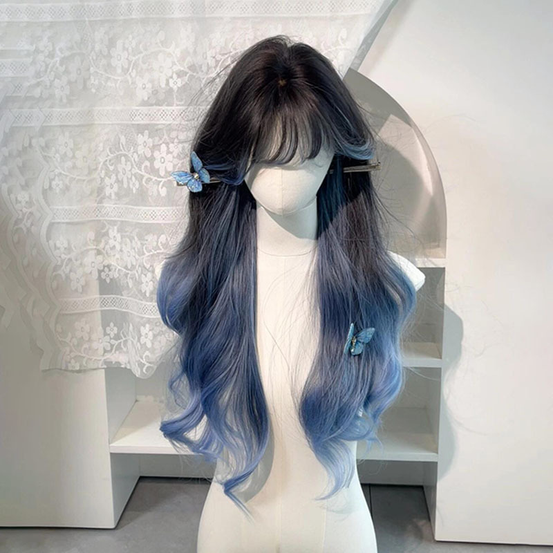 [Butterfly Dream] 女性用ウィッグ ブルー パイント グラデーション シャイニー ロング カーリーヘア デイリー 同スタイル ビッグ ウェーブ フルヘッド カバー スタイル