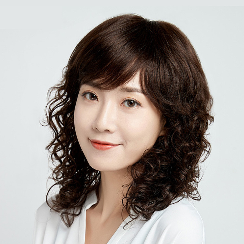 短いカールのかつらの女性は斜めの前髪の中で短いかつらを掛けます。
