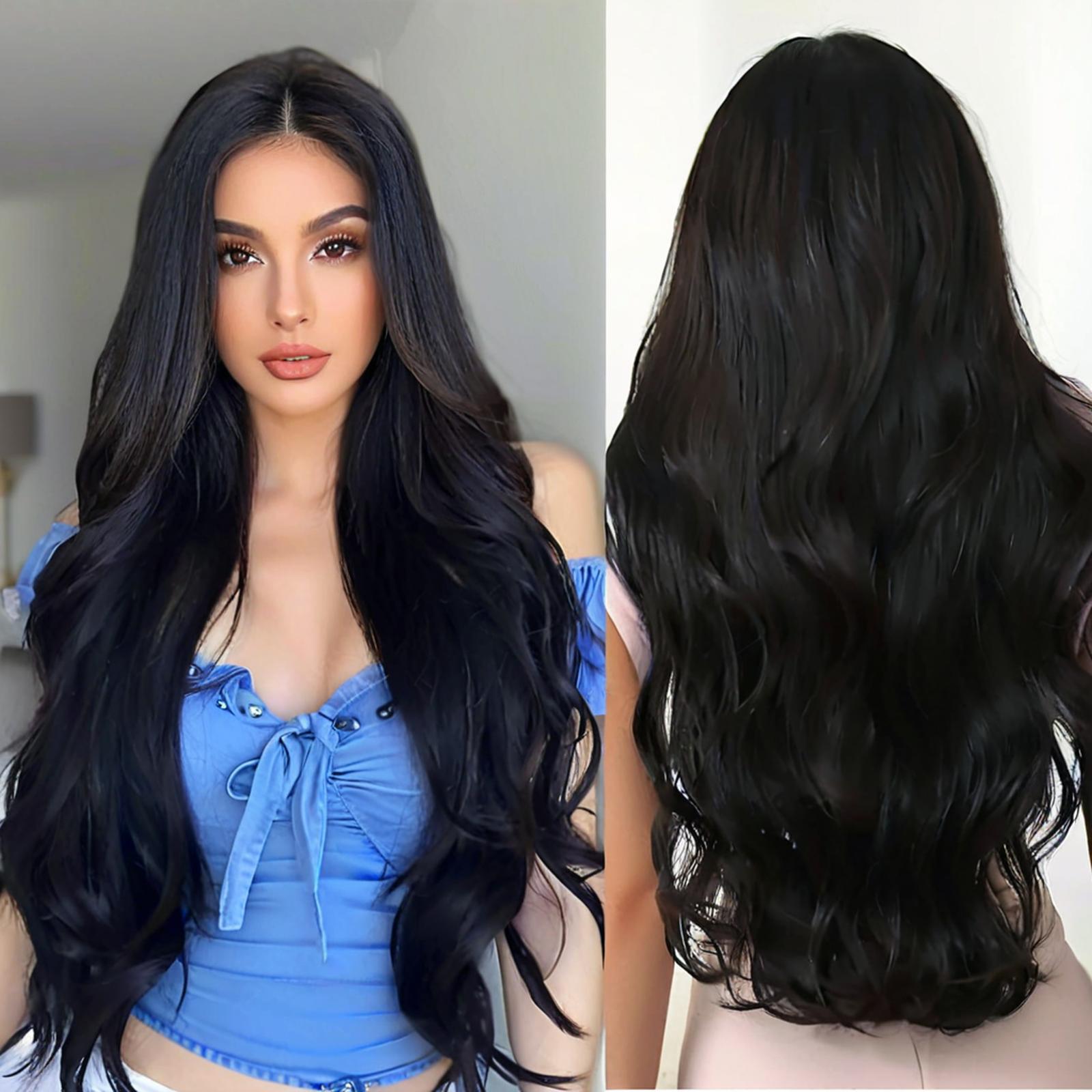 越境貿易用ウィッグ 女性用ミドルパートロングカールヘアセット 黒色ビッグウェーブロングヘア マシンメイドウィッグ 一件代発送対応