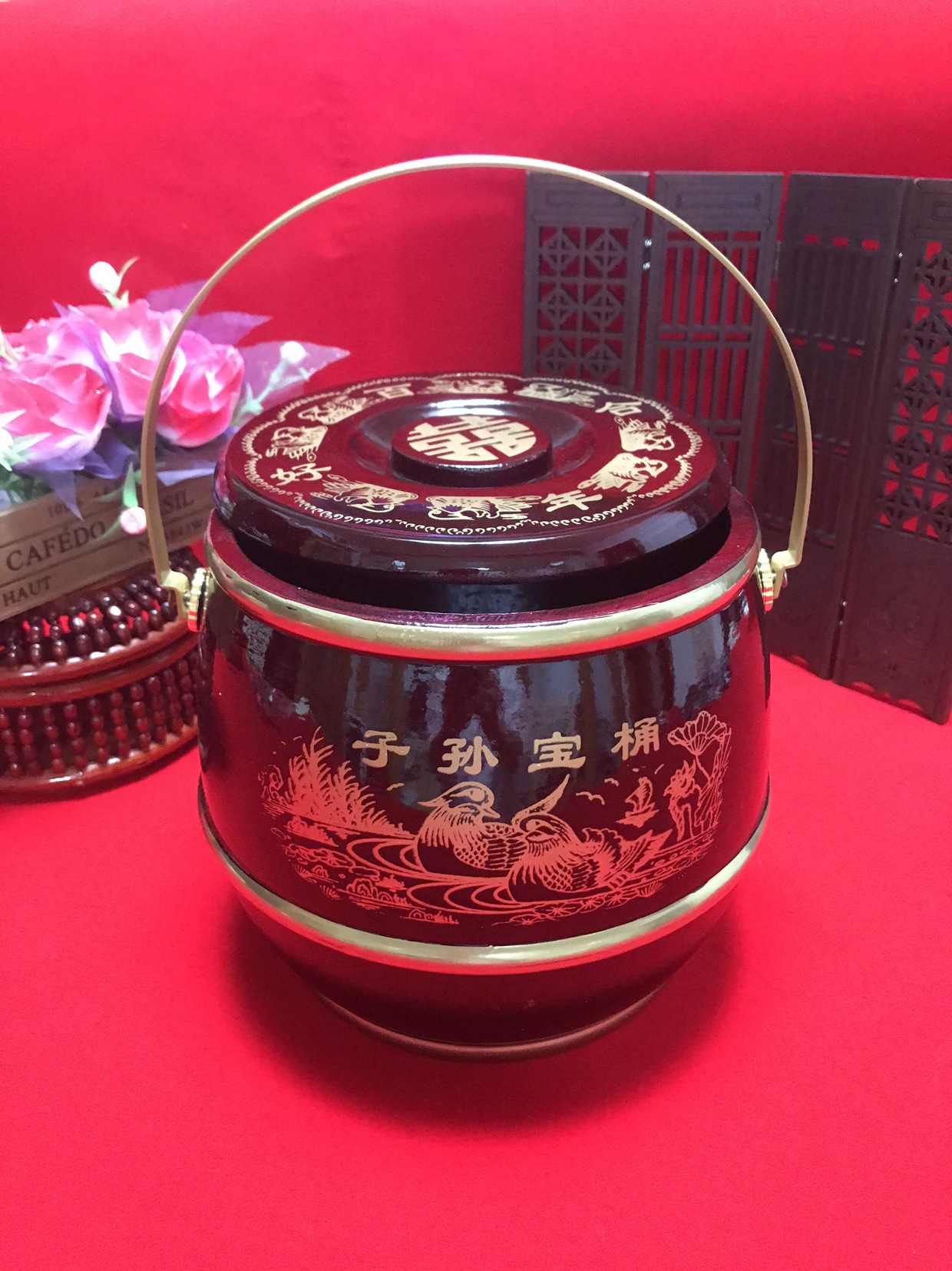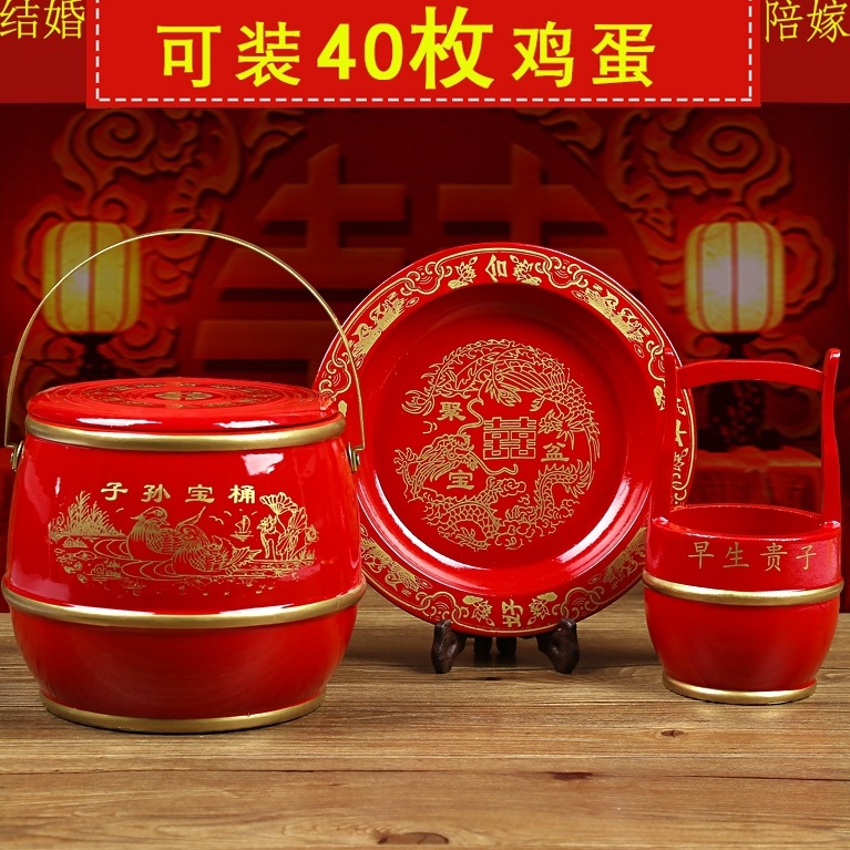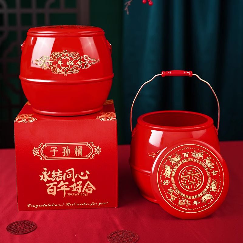 子孫バケツ、結婚式用の赤い嫁入り用品、陶器製のつばき、娘の嫁入り用の幸せなバケツ