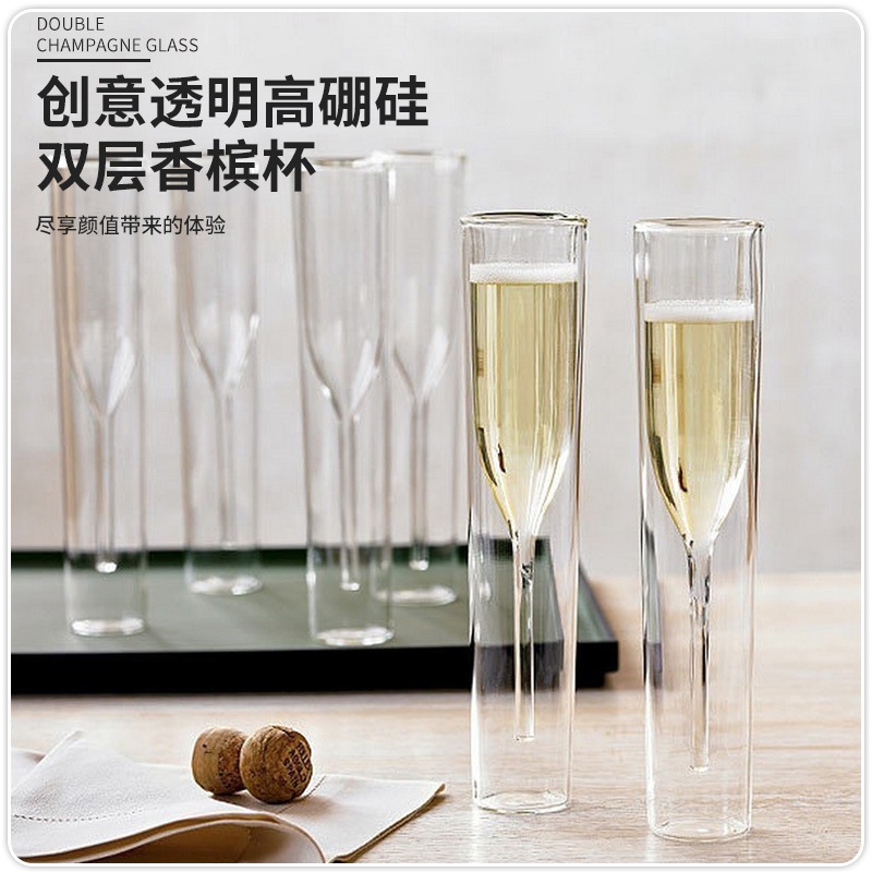 クリエイティブな高硼珪酸ガラス製二重構造シャンパングラス、透明ガラス製ワイングラス、高脚グラス、スパークリンググラス、ウェディングカクテルグラス、卸売