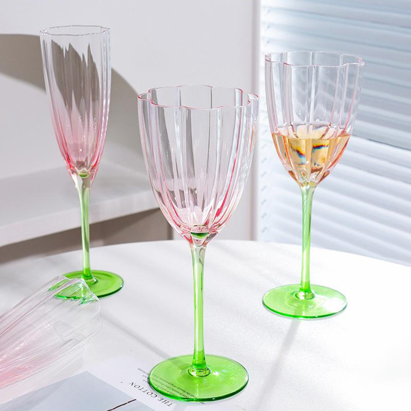 透明な花のワイングラスの新型の花びらの杯の緑色のシャンパンの杯の卸売りのホテルのレストランの長いまっすぐなガラスの杯