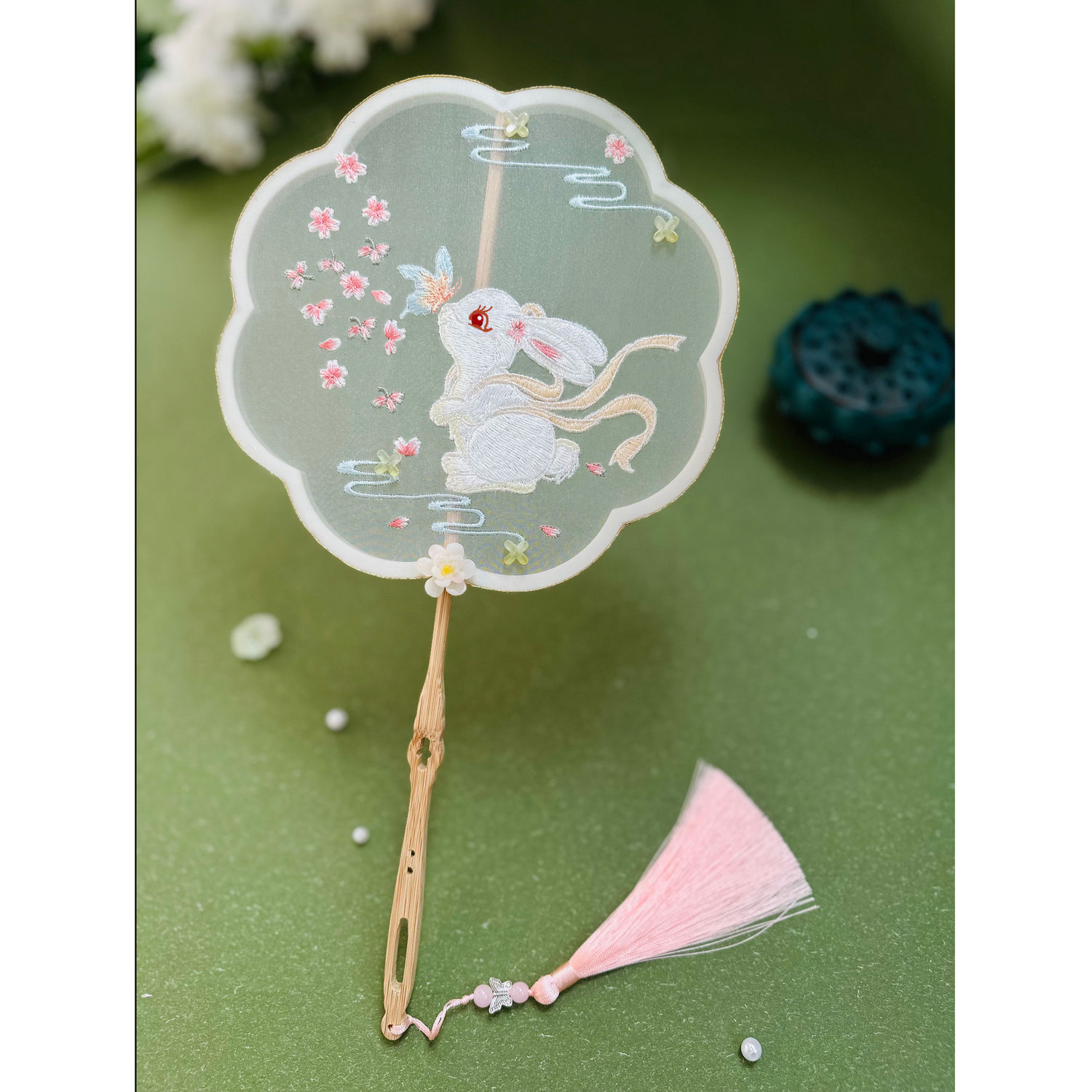 古代風宮殿扇子、古典刺繍扇子、中国風長短柄丸型特殊形状扇子、刺繍扇子、漢服ダンス扇子