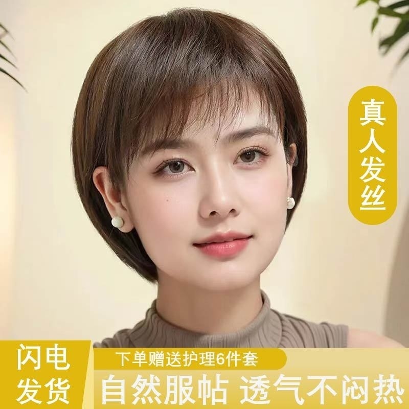女性用ウィッグ ショートリアルヘア 本物の髪 中高年ママ用フルヘッドセット 本物の髪 ショートストレートヘア 本物のヘアセット 超軽量