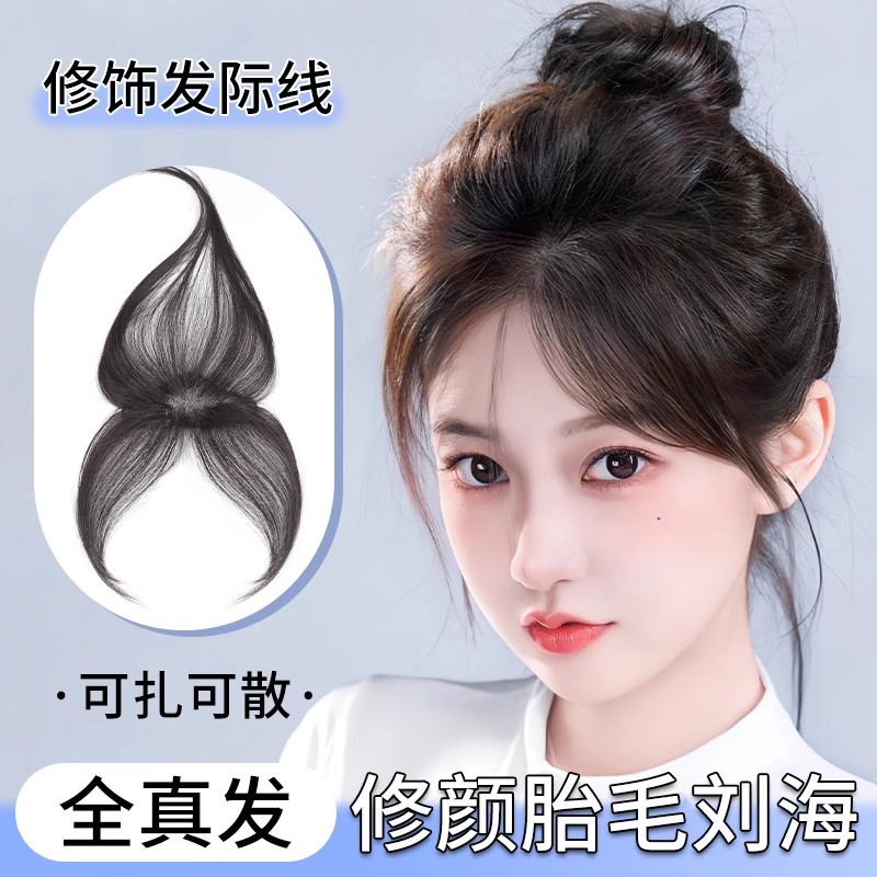 女性用胎児毛前髪ウィッグ、頭頂部の本物の髪、自然な額と耳の毛、軽くて跡のないヘアラインウィッグステッカー
