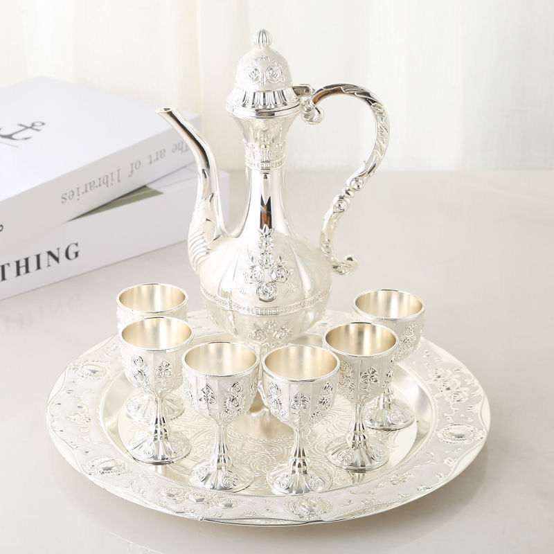 純銀ワイングラスとフラスコヨーロピアンスタイルの小さなワイングラスとワインセットギフトボックス付きハイエンドレトロシルバー家庭用品